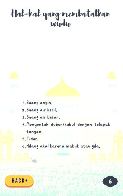 Hal-hal yang membatalkan wudu 1. Buang angin. 2. Buang air kecil. 3. Buang air besar. 4. Menyentuh dubur/kubul dengan telapak tangan. 5. Tidur. 6. Hilang akal karena mabuk atau gila. 6