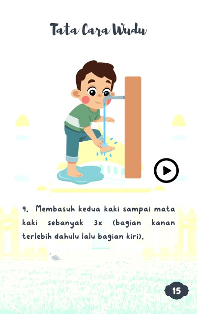 Tata Cara Wudu 9. Membasuh kedua kaki sampai mata kaki sebanyak 3x (bagian kanan terlebih dahulu lalu bagian kiri). 15