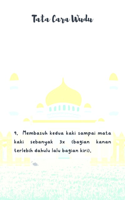 Tata Cara Wudu 9. Membasuh kedua kaki sampai mata kaki sebanyak 3x (bagian kanan terlebih dahulu lalu bagian kiri).