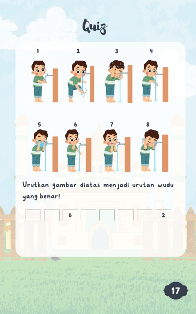 Quiz 1 2 3 4 5 6 7 8 Urutkan gambar diatas menjadi urutan wudu yang benar! 6 2 17