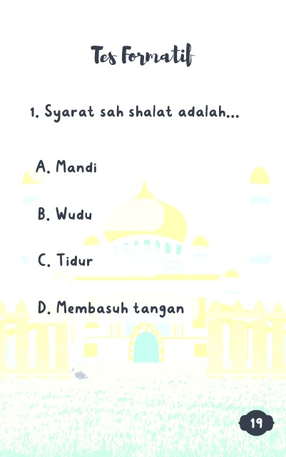 Tes Formatif 1. Syarat sah shalat adalah... A. Mandi B. Wudu C. Tidur D. Membasuh tangan 19