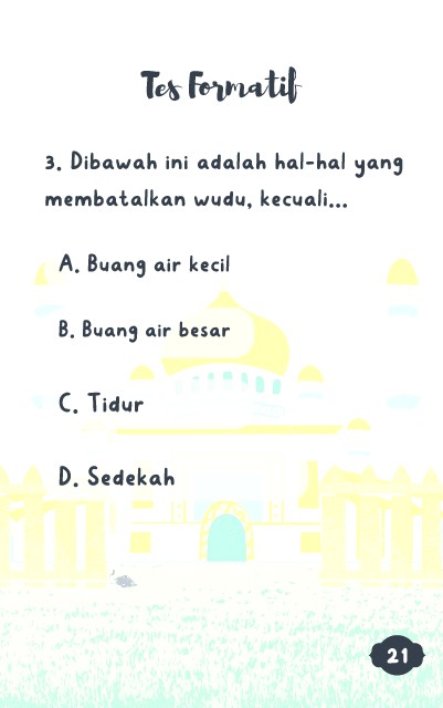 Tes Formatif 3. Dibawah ini adalah hal-hal yang membatalkan wudu, kecuali... A. Buang air kecil B. Buang air besar C. Tidur D. Sedekah 21