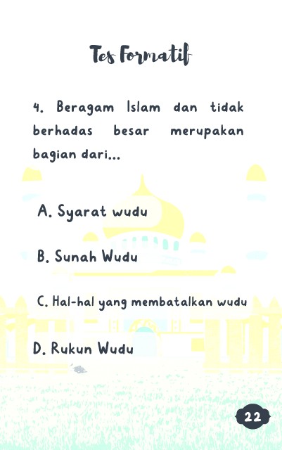 Tes Formatif 4. Beragam Islam dan tidak berhadas besar merupakan bagian dari... A. Syarat wudu B. Sunah Wudu C. Hal-hal yang membatalkan wudu D. Rukun Wudu 22