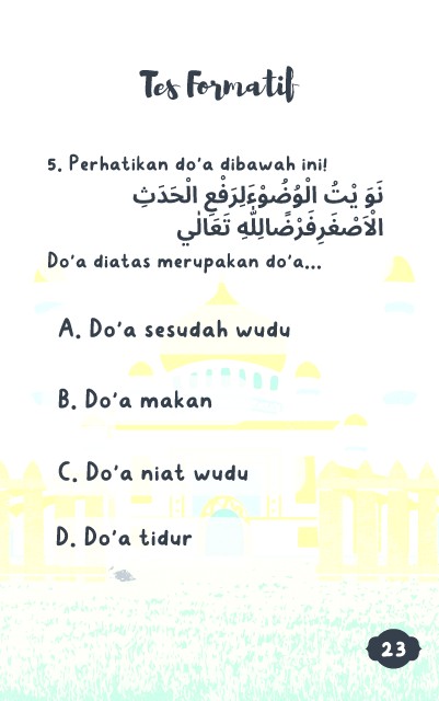 Tes Formatif 5. Perhatikan do'a dibawah ini! ْ ْ ْ َ ُ ُ َ ِ ثَﺪَﺤﻟا ﻊﻓَﺮﻟءﻮﺿُﻮﻟا ﺖْﻳ ﻮﻧ ِ َ ْ ِ َ ﱣ ْ ٰ َ َ ً َ ِ ﻲﻟﺎَﻌﺗ ِﻪﻠﻟﺎﺿﺮﻓﺮﻐ ْ ﺻﻻا ْ ِ Do'a diatas merupakan do'a... A. Do'a sesudah wudu B. Do'a makan C. Do'a niat wudu D. Do'a tidur 23
