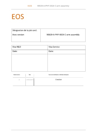 EOS 90639-A-PHY-0024 C-arm assembly EOS Désignation de la job card: Avec version 90639-A-PHY-0024 C-arm assembly Visa R&D Visa Service Date: Date: Révision/version Date Nature des modifications/ modifications description A 18-06-2019 Creation