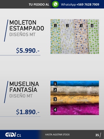 TU PEDIDO AL WhatsApp +569 7628 7909 MOLETON ESTAMPADO 1 2 3 4 DISEÑOS MT $5.990.- MUSELINA FANTASÍA DISEÑO MT $1.890.- HASTA AGOTAR STOCK 35