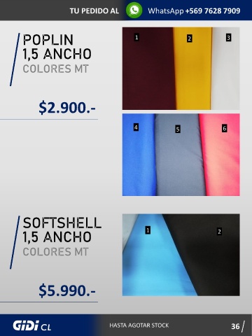 TU PEDIDO AL WhatsApp +569 7628 7909 POPLIN 1 2 3 1,5 ANCHO COLORES MT $2.900.- 4 5 6 SOFTSHELL 1,5 ANCHO 1 2 COLORES MT $5.990.- HASTA AGOTAR STOCK 36