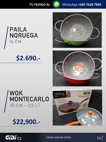 TU PEDIDO AL WhatsApp +569 7628 7909 PAILA NORUEGA 16 CM $2.690.- WOK MONTECARLO 30 CM – 3,5 LT $22,900.- HASTA AGOTAR STOCK 53
