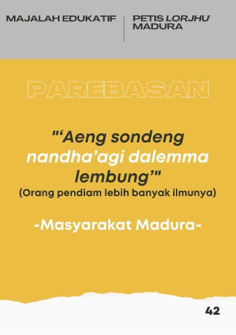 MAJALAH EDUKATIF PETIS LORJHU' MADURA PAREBASAN "‘Aeng sondeng nandha’agi dalemma lembung’" (Orang pendiam lebih banyak ilmunya) -Masyarakat Madura- 42