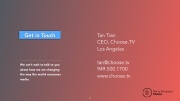 Get in Touch Tan Tran CEO, Choose.TV Los Angeles tan@choose.tv 949.500.1700 www.choose.tv We can’t wait to talk to you about how we are changing the way the world consumes media. 8