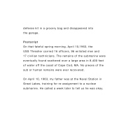 17 civilian technicians. The remains of the submarine were eventually found scattered over a large area in 8,400 feet of water off the coast of Cape Cod, MA. No pieces of the sub or human remains were ever recovered.