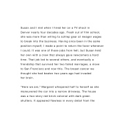 Denver nearly four decades ago. Fresh out of film school, she was more than willing to schlep gear at meager wages to break into the business. Having once been in the same position myself, I made a point to return the favor whenever I could. It was one of those jobs from hell, but Susan held her own with a crew that always gave newcomers a hard time. That job led to several others, and eventually a friendship that survived her two failed marriages, a move