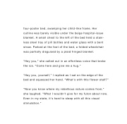 four-poster bed, swamping her child-like frame. Her outline was barely visible under the beige hospital-issue blanket. A small chest to the left of the bed held a stain- less steel tray of pill bottles and water glass with a bent straw. Parked at the foot of the bed, a folded wheelchair was partially disguised by a plaid fringed blanket.