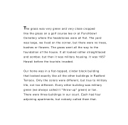 like the grass on a golf course tee or at Punchbowl Cemetery where the headstones were all flat. The yard was large, we lived on the corner, but there were no trees, bushes or flowers. The grass went all the way to the foundation of the house. It all looked rather straightlaced and somber, but then it was military housing. It was 1957 Hawaii before the tourists invaded.