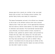 The base Commander arrived in his official car, dressed to the nines in the whitest uniform with more colored ribbons than I had ever seen. At the appropriate distance like he'd done a million times before, my father snapped to attention and saluted. The Commander saluted back. Less officially, he shook mother's hand, tousled my brother's hair, patted my sister’s head, and pinched my cheeks the way older men always do. He said some things to my father, I don't remember the exact words, but they had something to do with my father's Navy record. I wondered why he was giving my father all the attention when mother was the reason we were all there, but she didn't seem to notice.