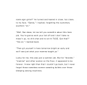 “Well, San-deee, let me tell you somethin about this-here job. You’re gonna work your tail off and I don’t take no mess’n up, no chit-chat and no at-tit-TUDE. Got that?” “Yes sir,” I barked back.