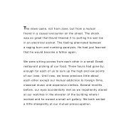 each other except our mutual addiction to foreign films, classical music and expensive clothes. Several months before, our eyes accidentally met as we impatiently stared at our watches in the elevator of the building where I worked and he owned a small art gallery. We both smiled a little sheepishly at our mutual preoccupation.