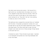 The stairs were narrow and uneven. I felt around for a light switch as I stumbled down the steps, but no luck. I only needed to stay down here five minutes. That's all Joe and Tony said it would take for the counter guy to come looking for me. They didn't tell me I'd be waiting to make my move in this rat hole.