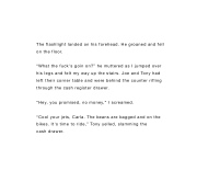 “What the fuck's goin on?” he muttered as I jumped over his legs and felt my way up the stairs. Joe and Tony had left their corner table and were behind the counter rifling through the cash register drawer.