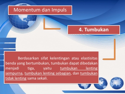 Momentum dan Impuls 4. Tumbukan Berdasarkan sifat kelentingan atau elastisitas benda yang bertumbukan, tumbukan dapat dibedakan menjadi tiga, yaitu tumbukan lenting sempurna, tumbukan lenting sebagian, dan tumbukan tidak lenting sama sekali.