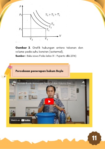 Gambar 2. Grafik hubungan antara tekanan dan volume pada suhu konstan (isotermal). Sumber : Buku siswa Fisika kelas XI : Pujianto dkk.2016) Percobaan penerapan hukum Boyle 11