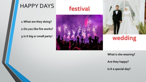 HAPPY DAYS 1-What are they doing? 2-Do you like fire works? 3-Is it big or small party? What is she wearing? Are they happy? Is it a special day?