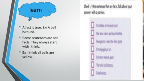 learn • A fact is true. Ex: A ball is round. • Some sentences are not facts. They always start with I think. • Ex :I think all balls are yellow.