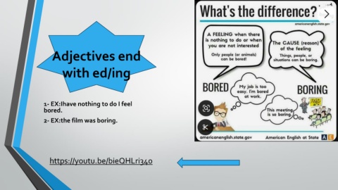 Adjectives end with ed/ing 1- EX:Ihave nothing to do I feel bored. 2- EX:the film was boring. https://youtu.be/bieQHLri340