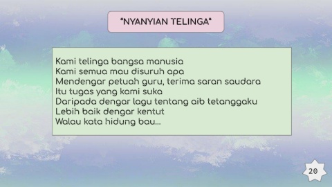 “NYANYIAN TELINGA” Kami telinga bangsa manusia Kami semua mau disuruh apa Mendengar petuah guru, terima saran saudara Itu tugas yang kami suka Daripada dengar lagu tentang aib tetanggaku Lebih baik dengar kentut Walau kata hidung bau… 20