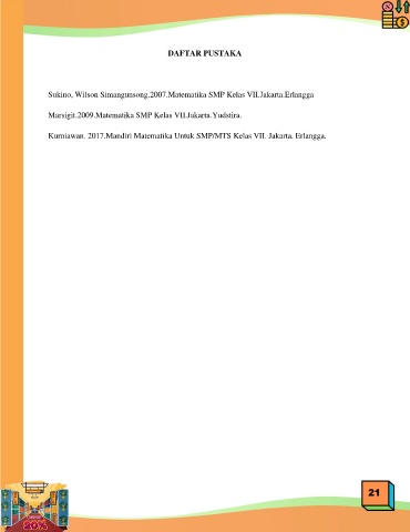 DAFTAR PUSTAKA Sukino, Wilson Simangunsong.2007.Matematika SMP Kelas VII.Jakarta.Erlangga Marsigit.2009.Matematika SMP Kelas VII.Jakarta.Yudstira. Kurniawan. 2017.Mandiri Matematika Untuk SMP/MTS Kelas VII. Jakarta. Erlangga. 18 21
