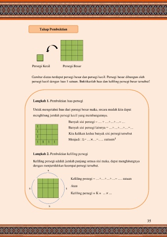 persegi kecil dengan luas 1 satuan. Buktikanlah luas dan keliling persegi besar tersebut!