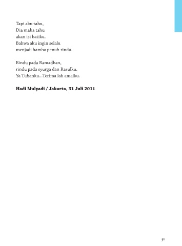 Tapi aku tahu, Dia maha tahu akan isi hatiku. Bahwa aku ingin selalu menjadi hamba penuh rindu. Rindu pada Ramadhan, rindu pada syurga dan Rasulku. Ya Tuhanku...Terima lah amalku. Hadi Mulyadi / Jakarta, 31 Juli 2011 31