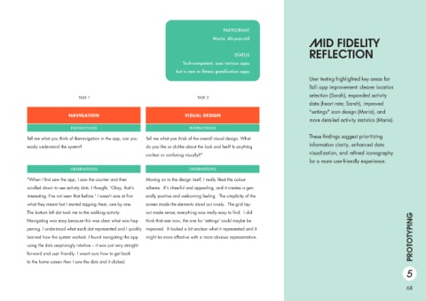 PARTICIPANT Maria: 40-year-old STATUS Tech-competent, uses various apps but is new to fitness gamification apps NAVIGATION VISUAL DESIGN INSTRUCTIONS INSTRUCTIONS OBSERVATIONS OBSERVATIONS PROTOTYPING 5 68