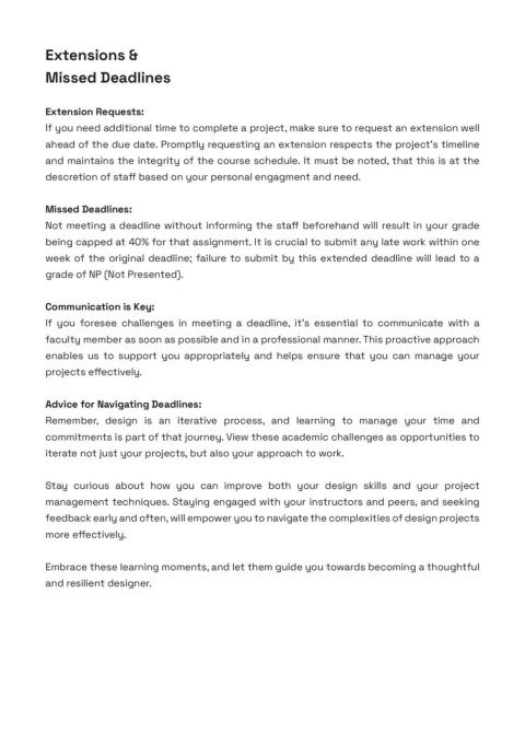 Not meeting a deadline without informing the staff beforehand will result in your grade