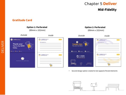 Chapter 5 Deliver Mid-Fidelity Gratitude Card Option 1: Perforated Option 2: Perforated (89mm x 102mm) (89mm x 102mm) Outside Inside Outside Inside DELIVER • Second design option created to test appeal of brand elements