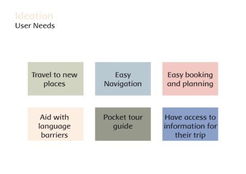 Ideation User Needs Travel to new Easy Easy booking places Navigation and planning Aid with Pocket tour Have access to language guide information for barriers their trip