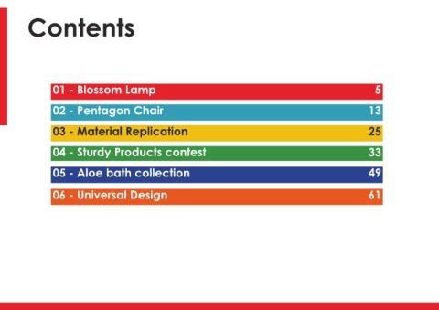 Contents 01 - Blossom Lamp 5 02 - Pentagon Chair 13 03 - Material Replication 25 04 - Sturdy Products contest 33 05 - Aloe bath collection 49 06 - Universal Design 61 4