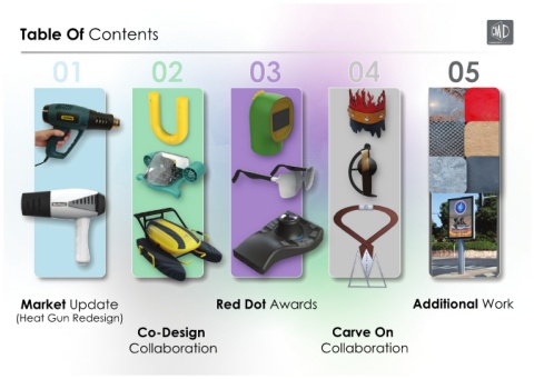 Table Of Contents 01 02 03 04 05 Market Update Red Dot Awards Additional Work (Heat Gun Redesign) Co-Design Carve On Collaboration Collaboration