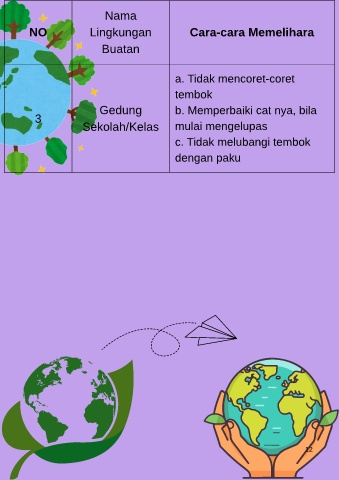 Nama NO Lingkungan Cara-cara Memelihara Buatan a. Tidak mencoret-coret tembok Gedung b. Memperbaiki cat nya, bila 3 Sekolah/Kelas mulai mengelupas c. Tidak melubangi tembok dengan paku 12
