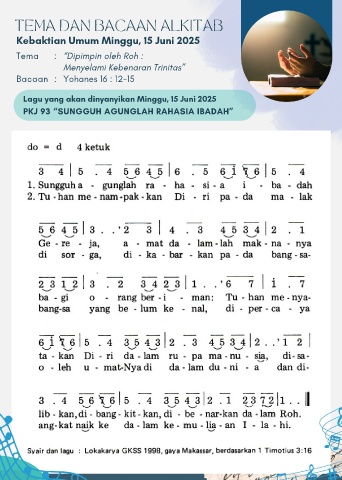 TEMA DAN BACAAN ALKITAB Kebaktian Umum Minggu, 15 Juni 2025 Tema : “Dipimpin oleh Roh : Menyelami Kebenaran Trinitas” Bacaan : Yohanes 16 : 12-15 Lagu yang akan dinyanyikan Minggu, 15 Juni 2025 PKJ 93 “SUNGGUH AGUNGLAH RAHASIA IBADAH”