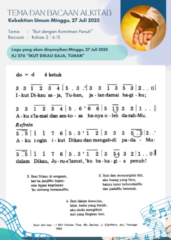 TEMA DAN BACAAN ALKITAB Kebaktian Umum Minggu, 27 Juli 2025 Tema : “Ikut dengan Komitmen Penuh” Bacaan : Kolose 2 : 6-15 Lagu yang akan dinyanyikan Minggu, 27 Juli 2025 KJ 376 “IKUT DIKAU SAJA, TUHAN”