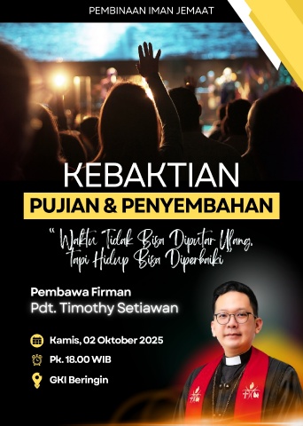 PEMBINAAN IMAN JEMAAT KEBAKTIAN PUJIAN & PENYEMBAHAN “ Waktu Tidak Bisa Diputar Ulang, tapi Hidup Bisa Diperbaiki ” Pembawa Firman Kamis, 02 Oktober 2025 Pk. 18.00 WIB GKI Beringin
