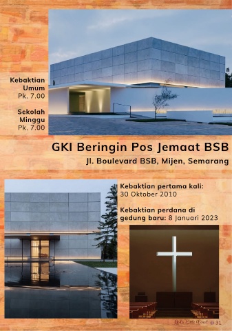Kebaktian Umum Pk. 7.00 Sekolah Minggu Pk. 7.00 GKI Beringin Pos Jemaat BSB Jl. Boulevard BSB, Mijen, Semarang Kebaktian pertama kali: 30 Oktober 2010 Kebaktian perdana di gedung baru: 8 Januari 2023 God’s Little Pencil 31