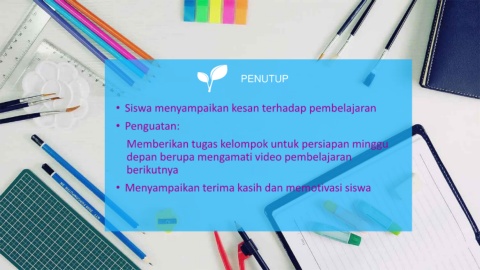 PENUTUP • Siswa menyampaikan kesan terhadap pembelajaran • Penguatan: Memberikan tugas kelompok untuk persiapan minggu depan berupa mengamati video pembelajaran berikutnya • Menyampaikan terima kasih dan memotivasi siswa