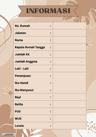 INFORMASI No. Rumah : Jabatan : Nama : Kepala Rumah Tangga : Jumlah KK : Jumlah Anggota : Laki - Laki : Perempuan : Ibu Hamil : Ibu Menyusui : Bayi : Balita : PUS : WUS : Lansia :