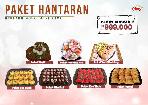paket hantaran B E R L A K U M U L A I J U N I 2 0 2 2 PAKET MAWAR 2 Rp 999.000 Paket Wajik Paket Pudding Art Paket Tart Wedding Paket Sus Buah Paket Mini Roll Paket Kue Thok Paket Pastel