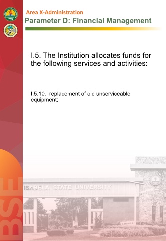 Parameter D: Financial Management I.5. The Institution allocates funds for the following services and activities: I.5.10. replacement of old unserviceable equipment;
