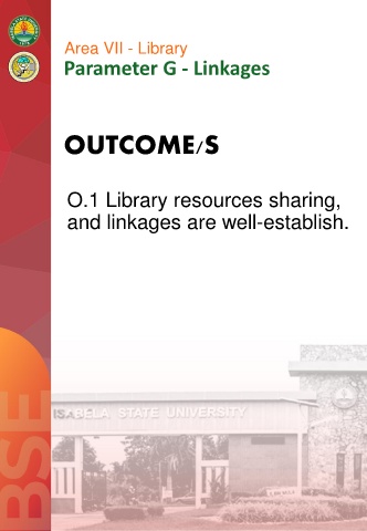 Area VII - Library Parameter G - Linkages OUTCOME/S O.1 Library resources sharing, and linkages are well-establish.