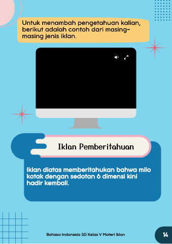 Untuk menambah pengetahuan kalian, berikut adalah contoh dari masing- masing jenis iklan. Iklan Pemberitahuan Iklan diatas memberitahukan bahwa milo kotak dengan sedotan 6 dimensi kini hadir kembali. Bahasa Indonesia SD Kelas V Materi Iklan 14