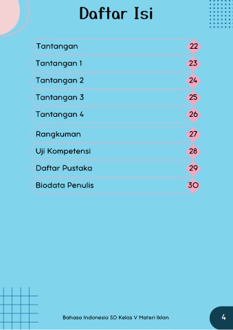 Daftar Isi Tantangan 22 Tantangan 1 23 Tantangan 2 24 Tantangan 3 25 Tantangan 4 26 Rangkuman 27 Uji Kompetensi 28 Daftar Pustaka 29 Biodata Penulis 30 Bahasa Indonesia SD Kelas V Materi Iklan 4